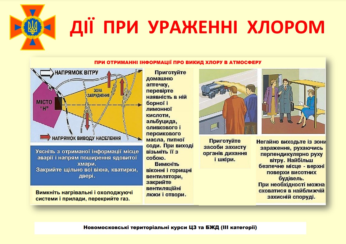 Хлор - це хімічна речовина, яке має подвійне призначення. Адже є і цілком звичні для нас місця, де використовують хлор. Наприклад, для дезінфекції води. При цьому хлор є смертельним для людини. Цю хімічну речовину досить часто застосовують в воєнних цілях, тому що вона швидко вивітрюється і сліди її використання можуть зникнути вже за лічені години. Тому фахівці для виявлення доказів застосування хлору в якості хімічної зброї повинні знаходитися безпосередньо в місці ураження або дуже близько від нього. В чистому вигляді хлор - газ зеленувато-жовтого відтінку з різким запахом. Але якщо випаровувати в повітрі рідкий хлор, то він швидко перетворюється на газ та утворює білий туман. При цьому на місці використання такої хімічної зброї з'являється відчутний запах звичайної хлорки, знайомий нам з дитинства. Основні симптоми отруєння хлором: зір затуманюється; відразу після впливу газу на шкірі з'являються бульбашки, почервоніння, людина відчуває сильний пекучий біль; в носі, горлі, очах з'являється печіння; задишка, утруднення дихання; нудота, в деяких випадках блювота; сльозотеча. При вдиханні хлору виникає ураження легень. Киснево-поглинальні альвеоли набрякають та можуть розірватися під час кашлю. Це призводить до появи крові в мокротинні. Варто звернути увагу, що хлор - важчий за повітря, а тому цей газ відразу буде опускатися вниз. Рятуючись від хімічної атаки з застосуванням хлору, необхідно підніматися вгору (верхні поверхи багатоповерхівок, пагорби, дах). Ще одне важливе запитання: скільки часу вивітрюється хлор? Зазвичай на це потрібно 6-7 годин, інколи більше. Перша допомога при отруєнні хлором: 1. Постраждалого негайно перемістити з забрудненої зони на свіже чисте повітря, щільно вкрити та дати подихати киснем, парами води чи аерозолем з питною содою (розчин 0,5%) протягом 15 хвилин. 2. Промити ніс, рот та відкриті ділянки шкіри водою з милом чи 2% розчином питної соди. Як вивести хлор з організму: давати пити воду та тепле молоко з содою. 3. Не давати потерпілому самостійно переміщатися, транспортувати дозволено лише в лежачому положенні. Варто пам'ятати, що не існує антидоту проти впливу хлору. Лікування полягає в тому, щоб якомога швидше вивести отруйну речовину з організму та надати домедичну допомогу. Корисні поради для тих, хто опинився в зоні ураження хлором: 1. Негайно заплющить очі та за можливості затримайте дихання. 2. Закутайтеся в верхній одяг та дихайте крізь нього (для кращого ефекту - тканину змочіть водою). 3. В жодному разі не біжіть. 4. Спробуйте визначити напрямок вітру, тому що виходити з зони ураження потрібно в бік, перпендикулярний йому. 5. Якщо немає можливості вийти з зони ураження, спробуйте переміститися вгору (стовп, драбина, дах). 6. Зніміть одяг, який був уражений хлором. Робити це потрібно не через голову, а розрізати чи розірвати тканину. При першій нагоді ретельно вимийте все тіло водою з милом. Якщо пари хлору потрапили в очі, зніміть контактні лінзи (за наявності) та промийте очі проточною водою (10-15 хвилин). Не одягайте лінзи знову. 7. За відсутності протигазу можна використовувати ватно-марлеву пов'язку, просочену 5% розчином питної соди.